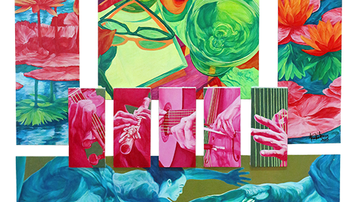 Issus des mythologies grecque ou latine, biblique ou évangélique, artistique ou quotidienne, les histoires que je raconte sont insérées dans une forme issue de l’art sacré: le retable. Avec ou sans volets, ils sont construits sur ces bases, ils sont une méditation sur notre monde, sur son histoire et ses histoires, sur l’image qu’on s’en fait et qu’on s’en donne, sur celle qui nous est inculquée par les modèles dominants de pensée.